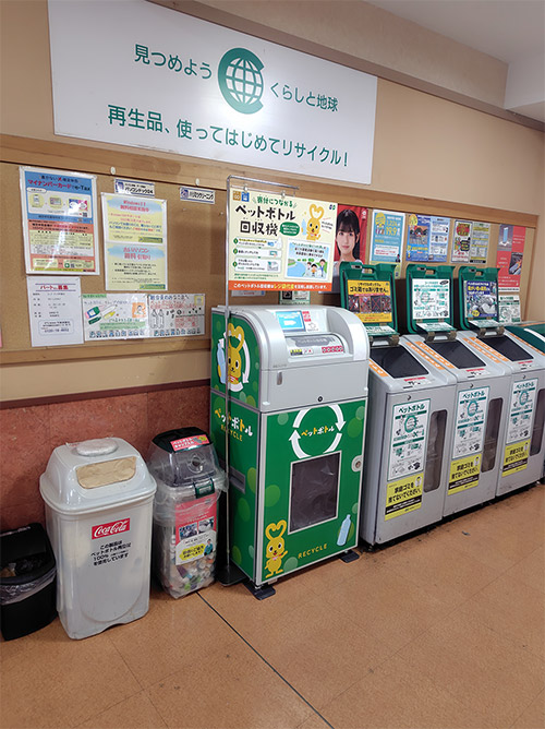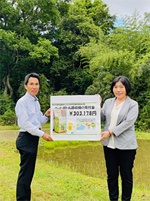 一部店舗に設置している「寄付機能付きペットボトル減容回収機」を通じて回収した、ペットボトル1本につき1円を環境保全に取り組む団体へ寄付し、活動を支援しています。 2023年度に集まった50万5973円を6団体に寄付しました。