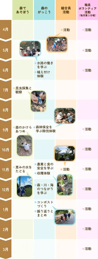 自然環境を保全するための整備活動や森と農、食べ物、くらしのつながりを学習するプログラムを展開します。